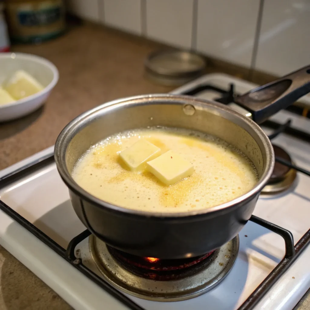 In a small saucepan, add the eggnog and butter. Warm it over medium-low heat until the butter melts completely. The mixture should be warm but not boiling too much heat can cause the chocolate to seize later.