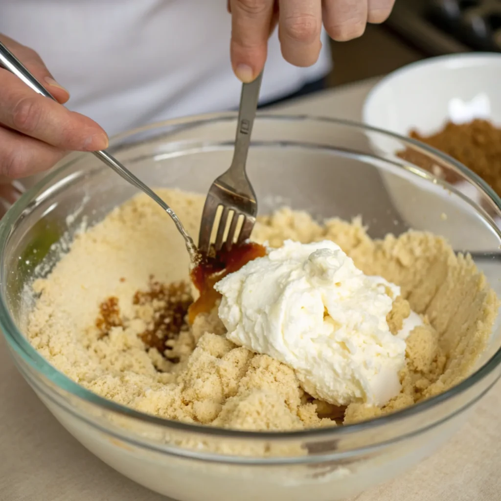 Add the softened cream cheese and vanilla extract to your cake crumbs. Use a fork or your hands to mix until the texture becomes smooth and dough-like. It should hold together easily.