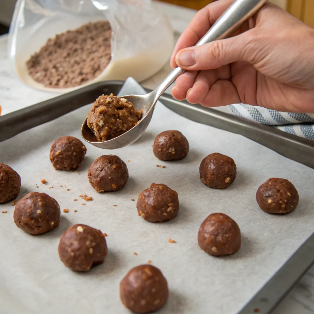 Scoop tablespoon-sized portions of the mixture and roll them into smooth balls. Place the truffle balls on a baking sheet lined with parchment paper.